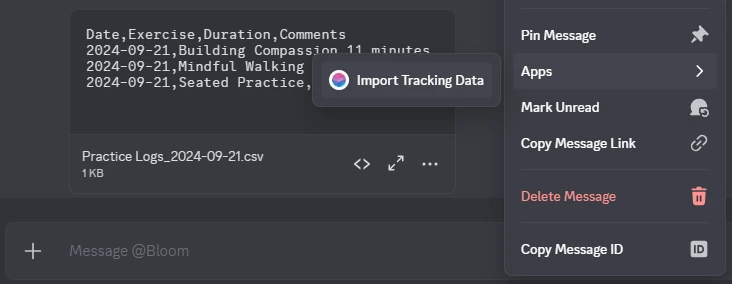 Alternatively, you can send a DM to Bloom with the log file attached, right-click (desktop) or long-press (mobile) the message, and select Import Tracking Data from the Apps context menu, as shown below. Select the import type and click Submit. The log file will be processed and the add will be announced in the #meditation-tracking channel, like usual.