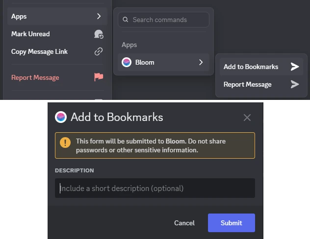 Note that context menu commands will not work in channels where you can’t send messages. To bookmark a message in such a channel, copy the message link and use /bookmark add in any channel where you can send messages.