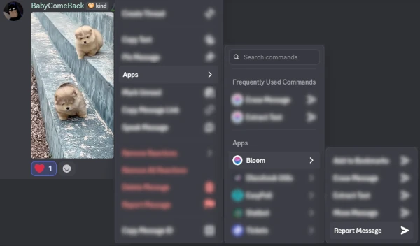 To report a message using the context menu, simply right-click (long-press on mobile) and select Apps > Bloom > Report Message. Below is an example of a message being reported for excessive adorableness. (Just a joke! We love adorable animals!)